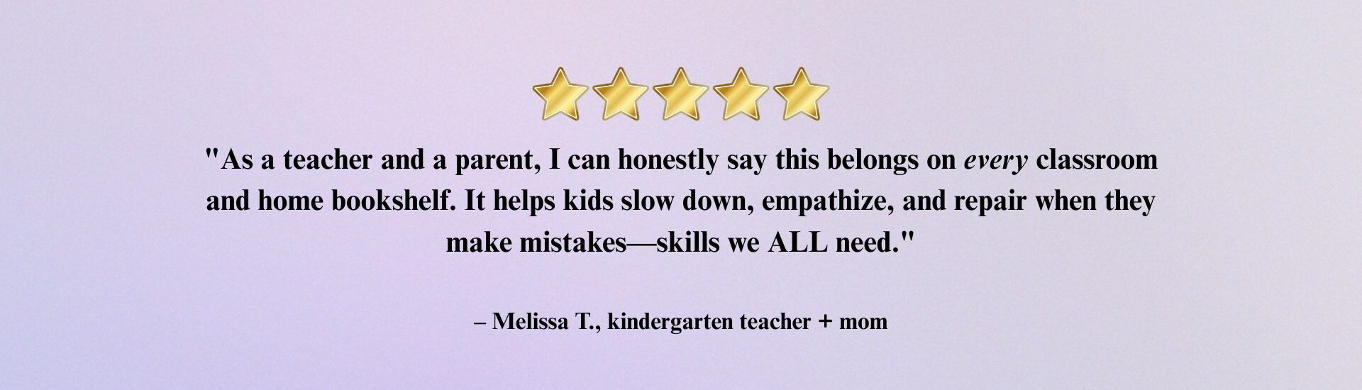 “As a teacher and a parent, I can honestly say this belongs on every classroom and home bookshelf. It helps kids slow down, empathize, and repair when they make mistakes—skills we ALL need.”